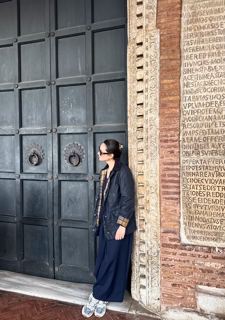 Ao fundo, o Arco de Constantino surge quase como uma imagem construída, lembrando que, aqui, cada abertura revela mais do que uma vista, revela camadas de poder, memória e permanência. Em Roma, até o olhar é arquitetado.